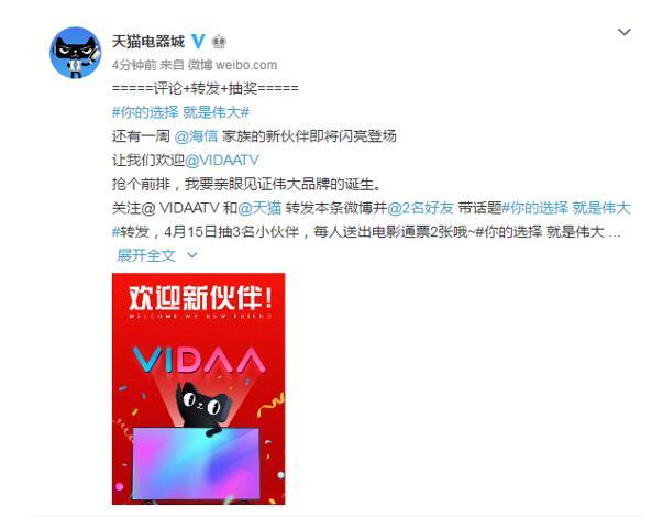 微博文案的信息量不可谓不大。这个新伙伴名为“VIDAA”,从话题文案来看与“伟大”谐音。VIDAA的身份在评论区可见端倪——黑科技、性价比、会说话的AI智能电视——喜提“小兄弟”的,正是海信家族最有竞争力的海信电视。