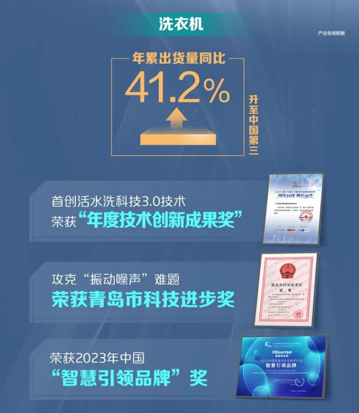 海信洗衣机以消费者洗护新需求为导向,不断强化洗护科技的创新和产品体验的升级,持续为全球用户提供更多更好的洗护产品。来自产业在线的数据显示,2023年前三季度,海信洗衣机年累出货量同比增长41.2%,升至中国第三。