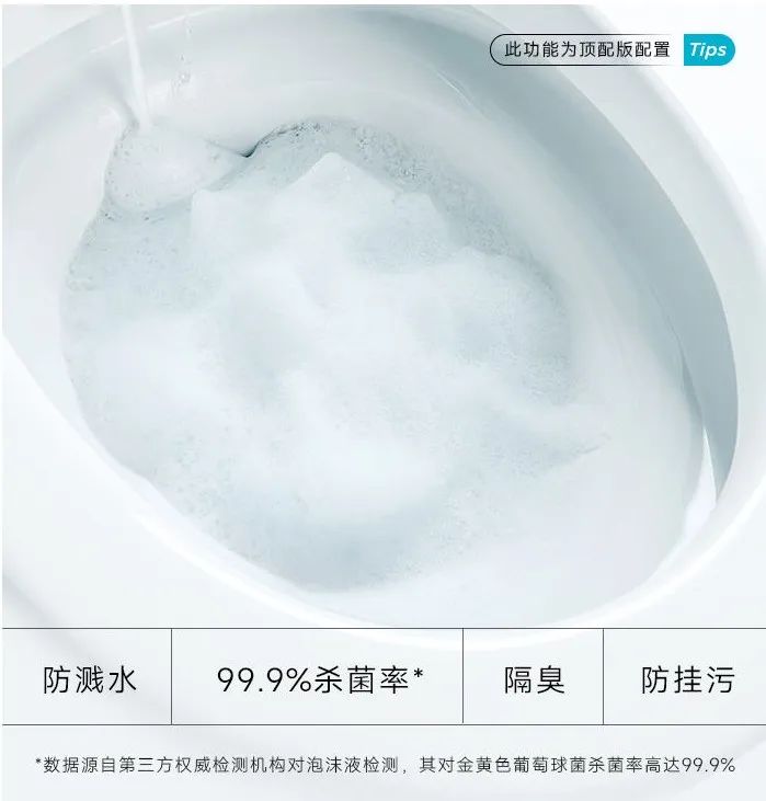 轻松压水花,隔绝飞溅细菌。X6泡沫盾杀菌率达到99.9%,防溅水效果优秀,能阻止男士小便飞溅,避免污染座圈及周围区域,有效减少细菌扩散,守护马桶周围空间的洁净。有了这项技术,不会再遇上座圈“水花乱溅”的尴尬名场面了。