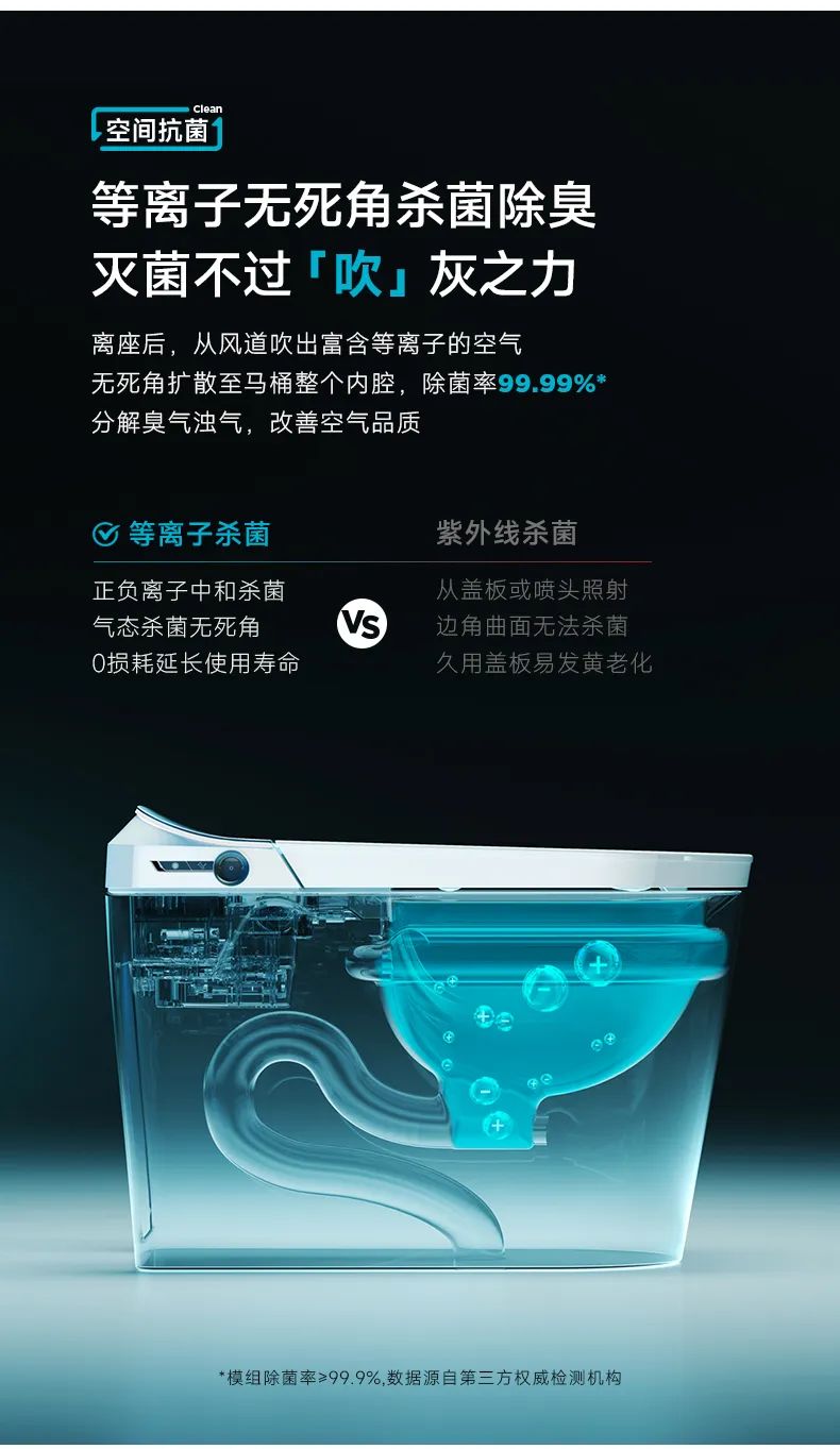 等离子灭菌更加面面俱到。离座后,X6风道中便吹出富含等离子的空气,会瞬间充满整个马桶内腔,再利用正负离子中和杀菌,分解臭气浊气,轻松解决紫外线无法照射到的边角曲面部位,改善整体空气品质,防止滋生细菌和臭味散发。
