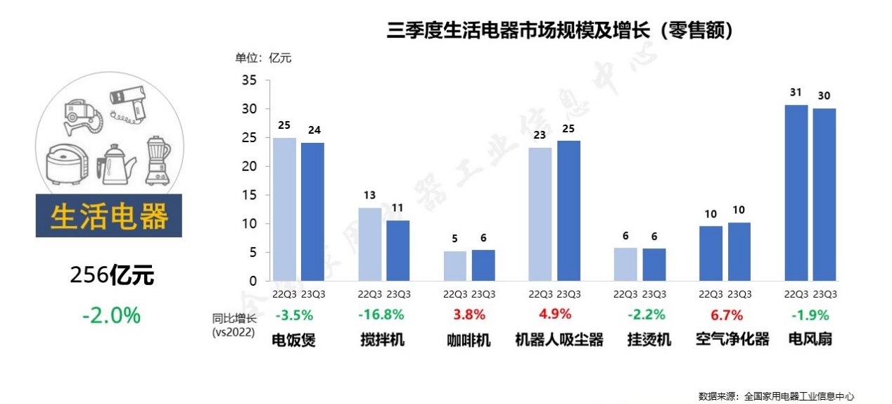 今年随着人们对外出餐饮、旅游热情的高涨,生活电器中部分品类热度有所下降,但原材料价格的回落为产品结构调整释放出空间。厨房小家电总体延续了需求不振的局面,电风扇以稳定的表现结束了2023销年,空气净化器产品升级调整初见成效,清洁电器两大品类扫地机器人、洗地机保持增长,美发产品和挂烫机受到出行社交需求的利好拉动。