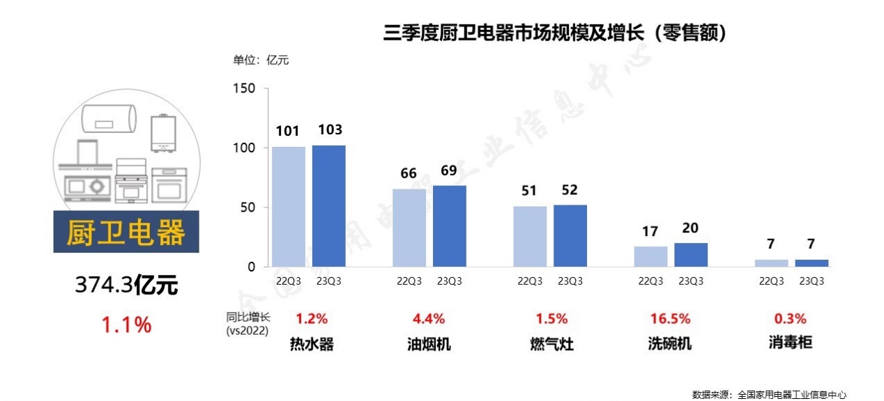 厨卫市场2023年整体稳健复苏,三季度环比增幅放缓但整体向上的趋势仍在延续,其中洗碗机、油烟机、燃气灶、热水器销售增长,集成灶市场下滑明显。厨电产品之间的协同合作,与装修风格的协调统一,以及对厨房空间的充分利用和留白,已经成为消费者和企业的共同追求。集成灶品类受消费降级、地产拖累、前期快速透支及集成烹饪中心产品快速崛起等影响,行业整体承压。