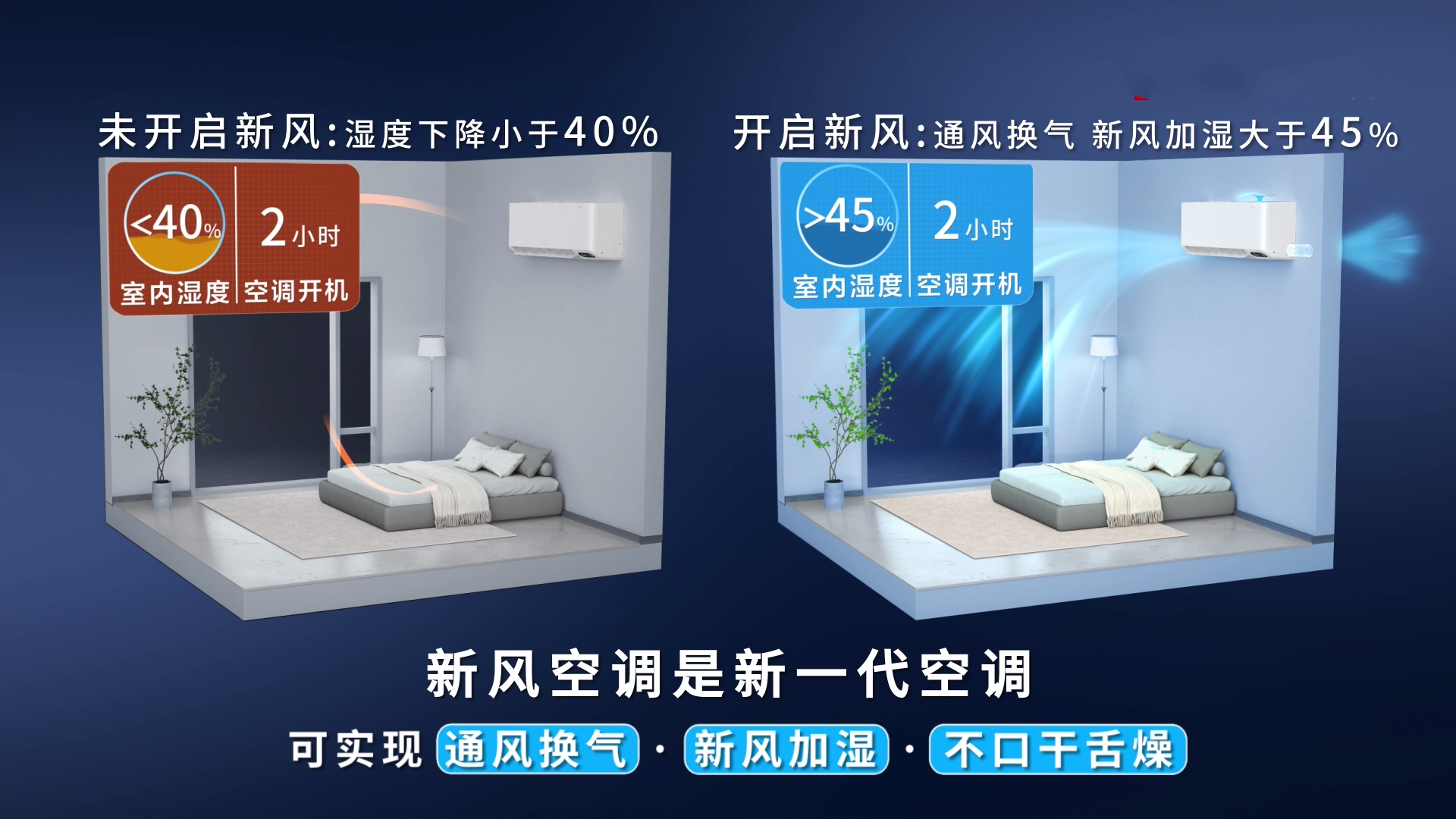 第一代空调是定频空调,解决用户制冷制热的需求;第二代空调是变频空调,解决用户节能舒适的需求;第三代空调是新风空调,也是最新一代空调,不仅可以解决制冷制热、舒适节能的需求,还可以综合解决室内环境和空气品质问题,满足用户舒适健康的需求。