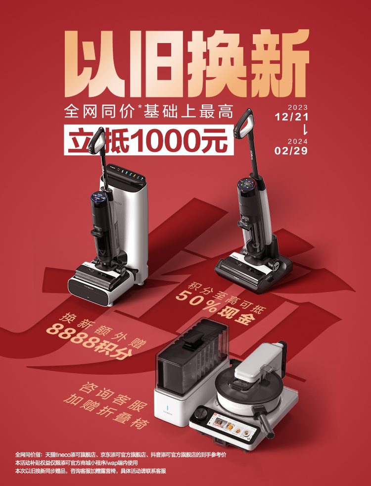 添可始终怀揣感恩之心,以真诚的关怀和卓越的技术回馈每一位用户。在新的一年,添可期待与更多用户相遇,共同书写更多幸福时刻。想了解更多活动详情,请微信搜索“添可官方商城”小程序,关注“以旧换新”更多内容请手机登录:https://m.tineco.com/h5/#/tradeNewByOld/views/index?channel=PRyjhx