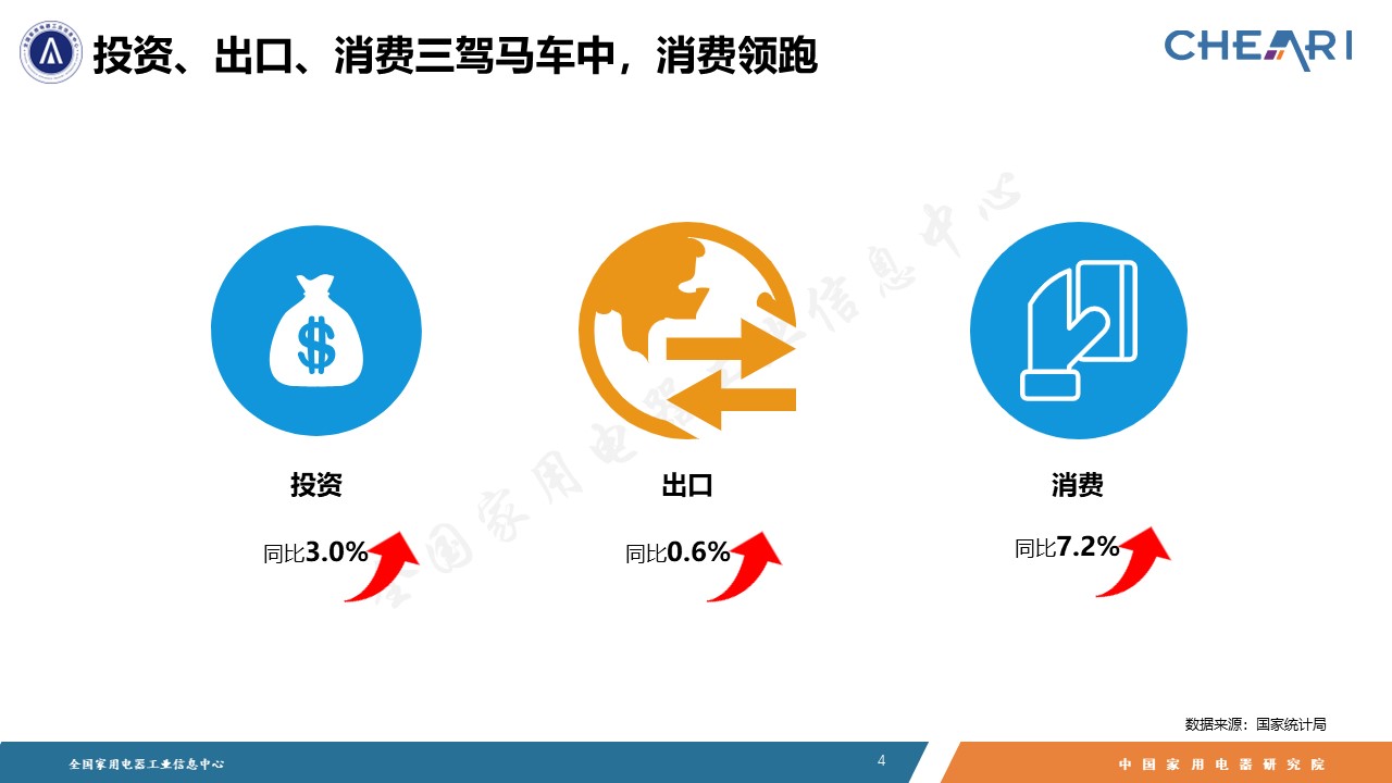 出口承压下,消费主引擎作用更加凸显,最终消费支出对经济增长的贡献率为82.5%。但需要指出的是,消费增速的大幅反弹是在较低基数下实现的,从多项宏观指标来看,当前消费市场终端需求偏弱,消费信心不足的问题仍然凸显。限额以上商品零售细分行业统计显示,家电家居等房地产相关消费仍然偏弱。2024年激发消费仍是稳增长的重中之重,促消费相关政策涉及家电产业的具体举措将包括:大力发展数字消费、绿色消费、健康消费,积极培育智能家居、国货“潮品”等新的消费增长点,促进电子产品等大宗消费,同时以提高技术、能耗、排放等标准为牵引,推动消费品以旧换新;持续推动开展家用电器、儿童用品、新兴消费品等产品质量分级。随着新消费需求的扩张,消费品的技术含量不断提高,未来新技术的应用和迭代,终端产品和制造过程的绿色化智能化,将是家电产业的主要升级方向。