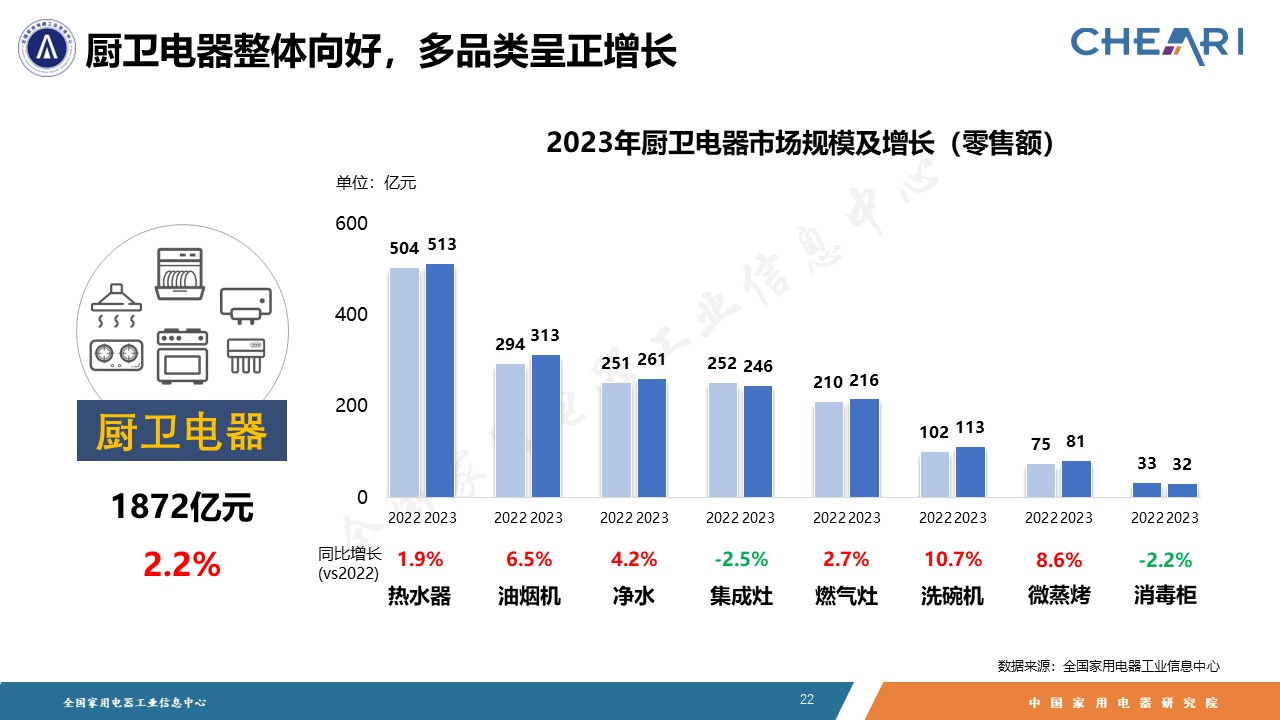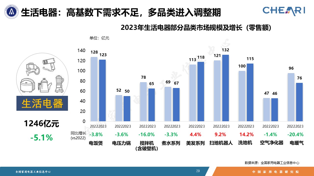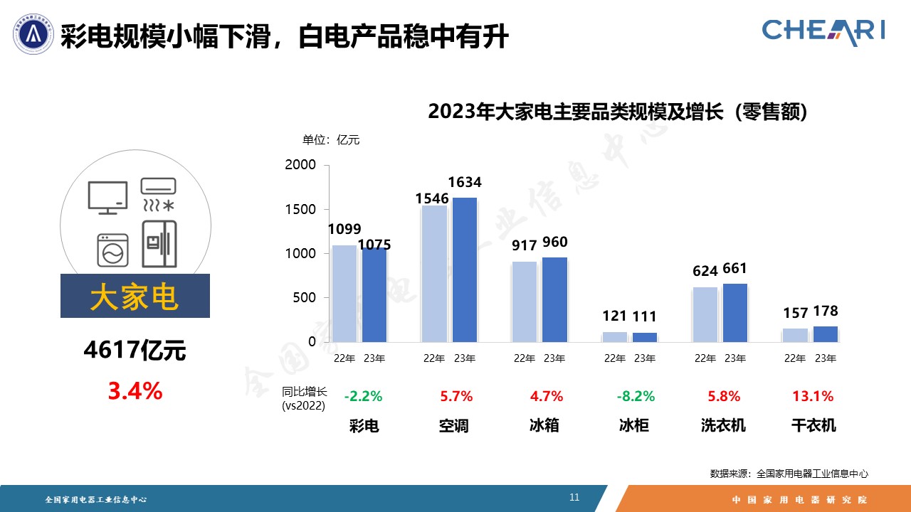 大家电销售在2023年实现了整体小幅增长,尤其是空调产品热销,为大家电增长提供了动力。从产品结构方面来看,各品类性能和功能均延续了升级的趋势,尤其是健康属性的不断拓展,为消费者提供了更好的使用体验。
