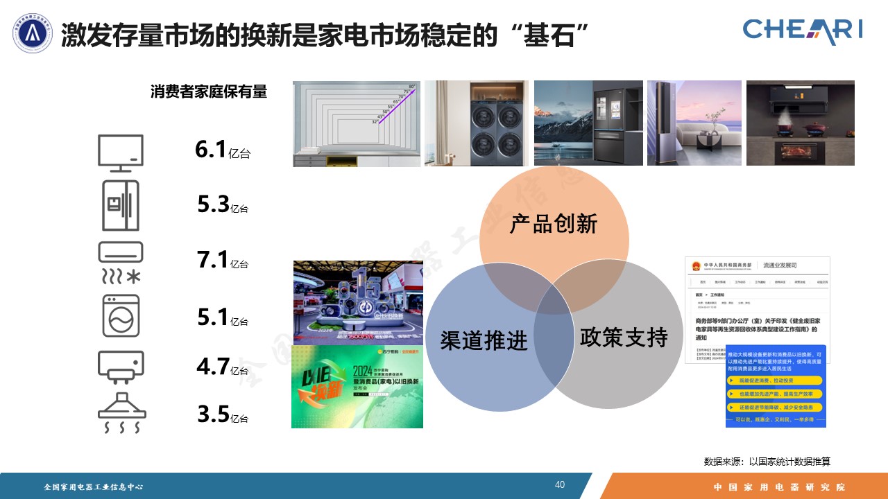 家电作为成熟的消费品,在我国居民家庭中有着很高的保有量,据推算仅彩电、空调、冰箱、洗衣机四类家电的保有量就达到25亿台,每年可以带来大量的换新需求。目前居民家中有着大量超期服役家电,不仅造成安全隐患,同时在能效、环保等方面也存在不利影响,因此新一轮家电换新具有迫切性和必要性。生产企业和流通渠道还需配合政策做好产品创新和渠道推进工作,在政府、生产企业、流通渠道“三位一体”的共同努力下,用升级的产品和更广阔的销售触达,充分激发消费者的换新需求。