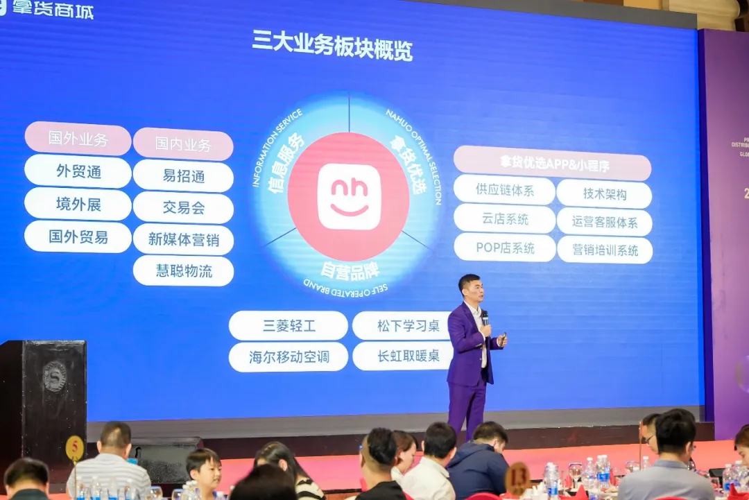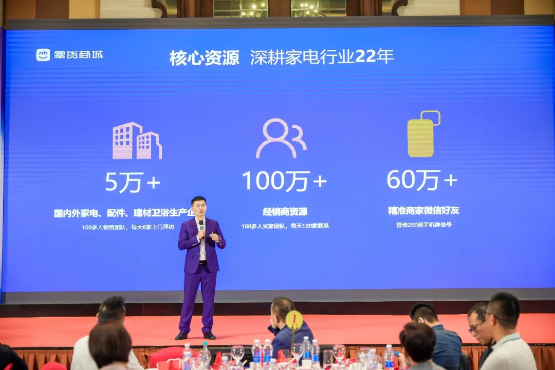 拿货商城创始人兼董事长喻治国介绍了拿货商城从2016年成立至今的发展历程和三年发展规划。拿货商城深耕家电行业22年,拥有国内外家电、配件、建材卫浴生产企业资源5万+,100万+经销商资源,60万+精准商家数据,目前有信息服务、自营品牌、拿货优选APP&小程序三大业务版块。