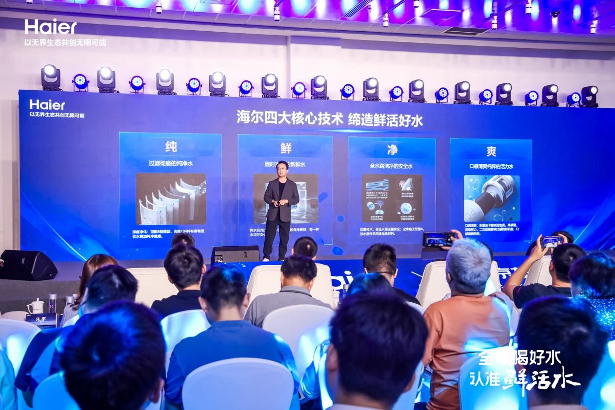 在发布会现场,海尔净水展示了实现鲜活净水的全套技术解决方案,方案核心为“纯、鲜、净、爽”四大技术。其中,“纯”代表了“过滤彻底的纯净水”,采用顶配8级精滤,去除104种有害物质,饮水更加纯净健康;“鲜”代表了“随时直饮的新鲜水”,利用纯水回流技术让管道内的饮水十分钟循环一次,24小时任何时候接到的第一杯水都是鲜活饮水,不再需要提前放掉长时间静置后被污染的陈水再接水;“净”代表了“全水路洁净的安全水”,利用抑菌技术抑制滤芯内细菌滋生,且全水路无双酚A,从制水到出水全流程、全时段安全,母婴家庭等用户无须担心饮用水滋生细菌伤害身体,可安心饮用;“爽”代表了“口感清新纯粹的活力水”,采用进口斯里兰卡椰壳活性炭,高碘值、高吸附力,二次改善影响口感的有机物,在冲泡茶水、咖啡等对水质口感要求较高的场景下也可以满足需求,释放出茶饮的最佳香气。