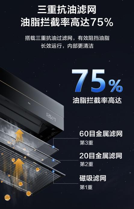 另外,厨房空调普及的难点之一,在于机身容易积聚油污,影响美观度和使用寿命。为此,TCL厨清爽厨房空调采用亚克力面板表面电镀处理,匹配全闭合导风板,隔绝油污易清洁,轻轻一擦就干净。而为了解决空调进风时会抽入大量油气,持久堆积后形成固态油垢的问题,TCL厨清爽厨房空调搭载磁吸滤网,以及20目+60目抗油金属滤网,三重过滤有效阻挡油脂,油脂拦截率达到75%,让空调内部更清洁,确保空调长效运行。