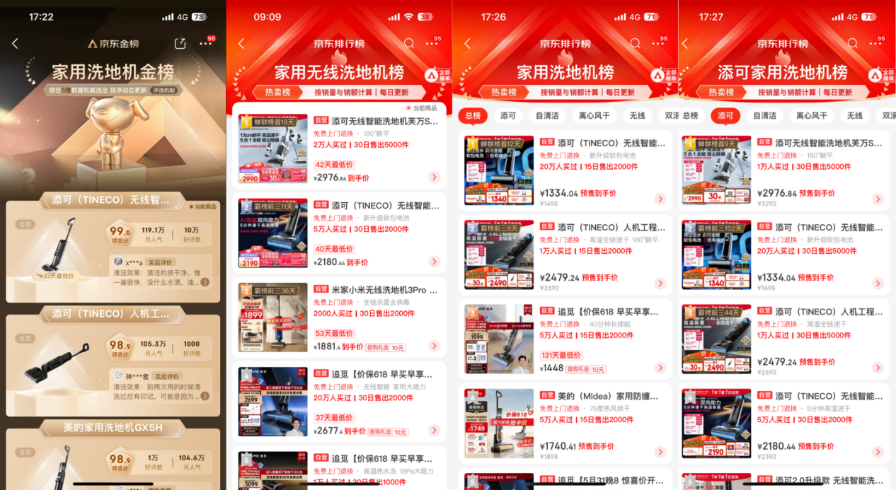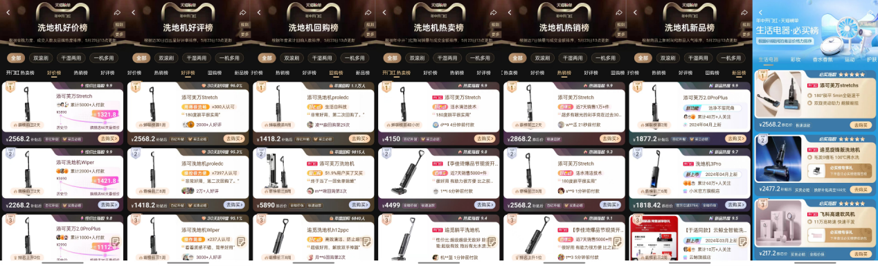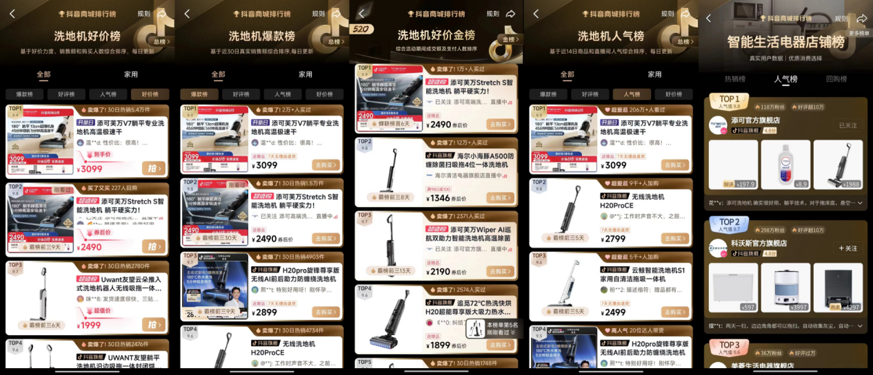 在抖音平台,添可凭借其卓越的市场表现和用户口碑,坐稳了洗地机爆款榜、好价金榜、人气榜等5大榜单的冠军宝座。截至目前,添可在三大平台共计摘取了16项榜单桂冠,卓越成绩印证了其在洗地机行业的领先地位与广泛影响力,而属于添可的618才刚刚吹响号角,后续表现值得期待。