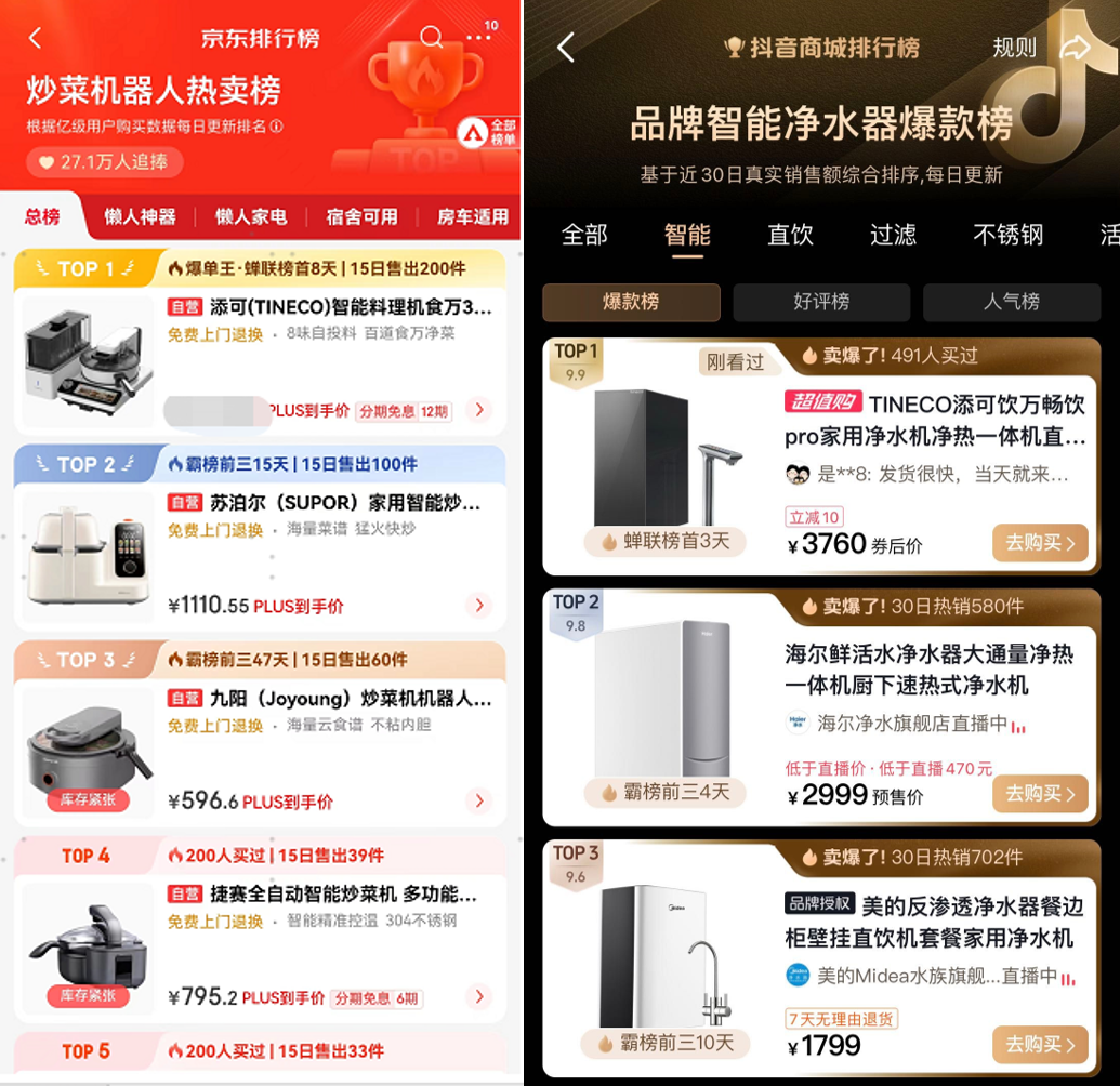 与此同时,今年618添可在厨房烹饪、健康生活领域也同样迎来了重大突破。添可食万智能料理机斩获京东的炒菜机器人热卖榜TOP1,而新品饮万畅饮Pro净热一体机则登上抖音商城品牌智能净水器爆款榜榜首。