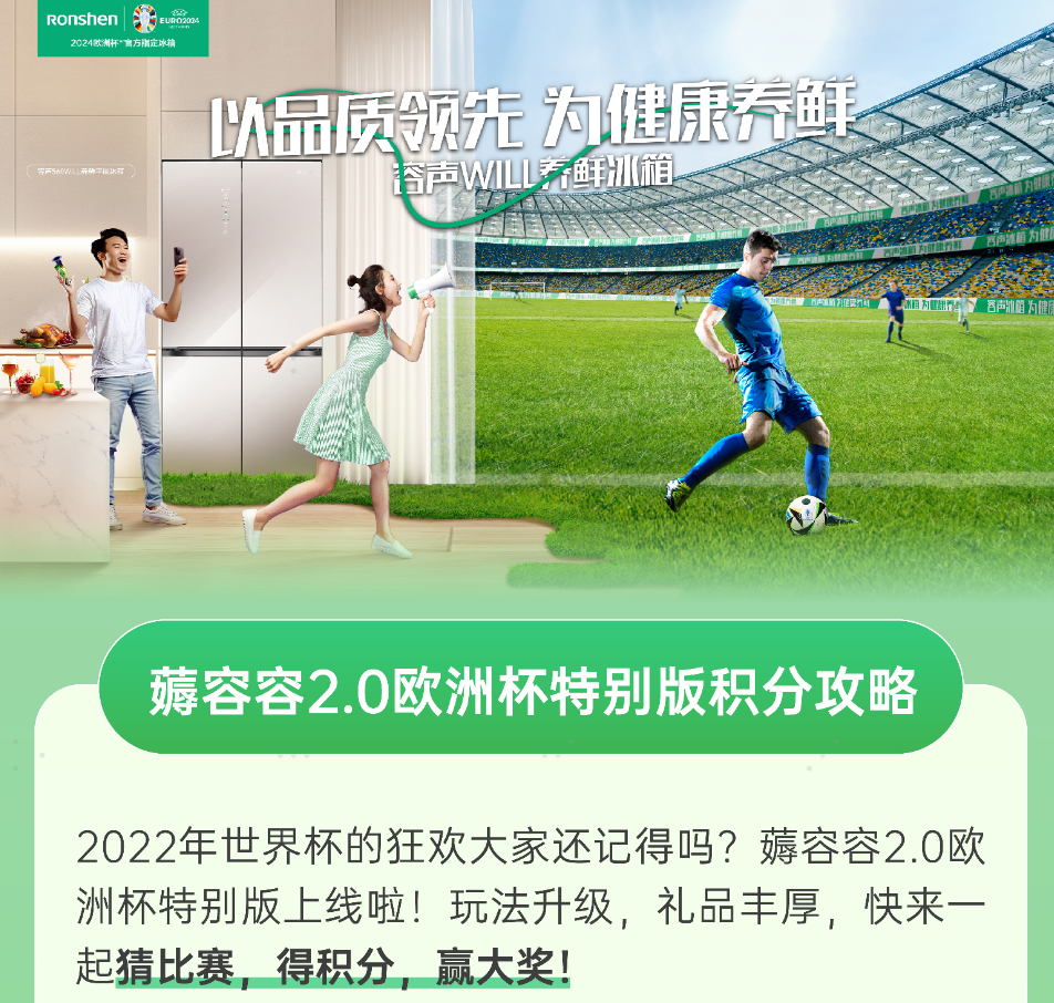 从好看好猜,到线上线下双向互动,相信有趣、真实的薅容容2.0会让云上狂欢的氛围不输千里以外的欧洲杯球场。而这些还只发生在欧洲杯预热阶段,随着小组赛、淘汰赛的展开,欧洲杯的热度进一步升温,薅容容也将继续推出丰富的内容和玩法,为欧洲杯再添一把火。同时,欧洲杯期间,容声的WILL养鲜冰箱和IDP双净冰箱也将在系数亮相,为用户带来全新的健康与品质的美好体验。