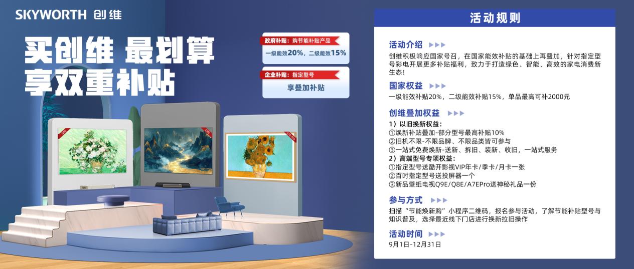 1、焕新补贴叠加,创维电视部分产品型号,再追加10%补贴发放,补贴金额最高可达3000元,旧机不限品牌、不限品类;