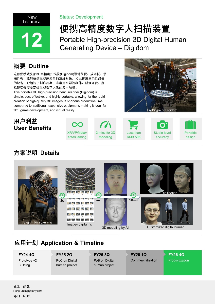 索尼作为一家建立在坚实技术基础上的创意娱乐公司,致力于与创作者共同创造感动,本次IISC大赛就有诸多提案关注用技术赋能创意,帮助创作者实现梦想。例如,索尼中国研究院员工提案的“便携高精度数字人扫描装置”,通过降低成本、增强便携性,相比传统复杂且昂贵的设备,缩短了制作周期,能够快速生成高质量的三维影像,未来可应用于影视制作、游戏开发、虚拟现实等需要高效生成数字人像的应用场景。