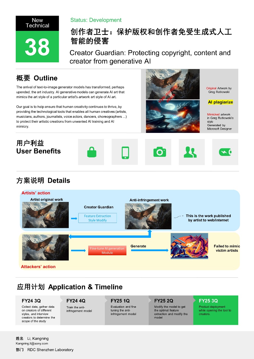 AI生成模型可以生成模仿特定艺术家作品风格的AI艺术,而由索尼中国研究院深圳研究院员工提出的“创作者卫士:保护版权和创作者免受生成式人工智能的侵害”提案,其目标是通过提供技术工具,帮助人类创意(艺术家、音乐家、作家、记者、配音演员、舞蹈家、编舞家……)保护他们的艺术创作免受不必要的AI训练和AI模仿,从而确保人类创造力继续蓬勃发展。