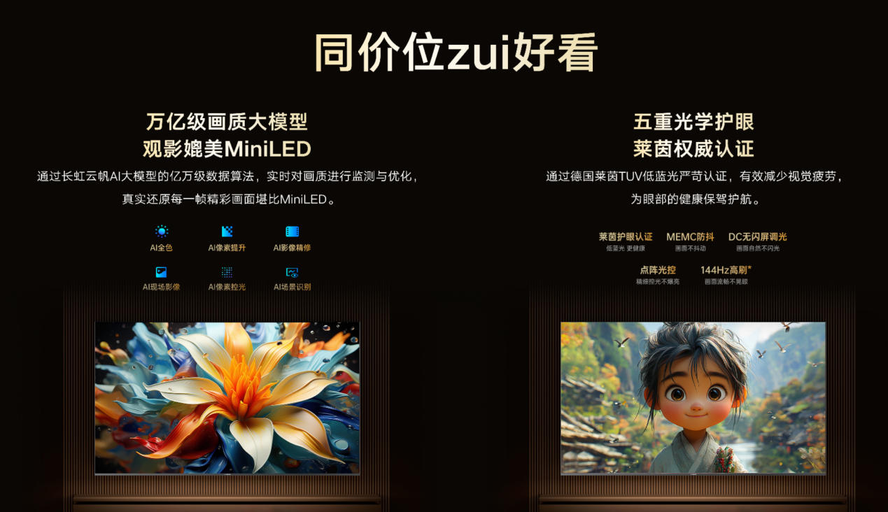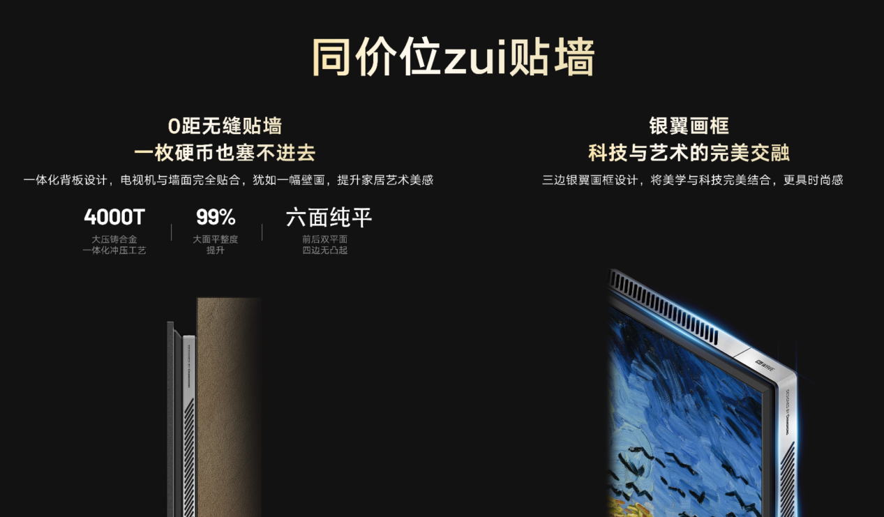 这是一台同价位最贴墙的壁画MiniLED电视。区别于传统电视,长虹U7H Mini采用一体化背板设计,采用4000T大压铸合金一体化冲压工艺,让其大面平整度提升至90%,真正实现0距离无缝贴墙,让客厅美如画。并且在三大散热结构专利加持下,航级双涵道散热技术能够使电视内部加速冷热空气对流,温度比一般壁画电视减低10℃,延长电视机使用寿命,避免墙面烧伤,真正做到了贴墙不烧墙,品质好壁画。