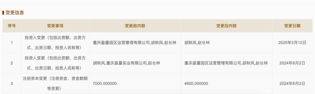 变更后,徐州盈量智能科技有限公司法人、大股东为胡秋风,其持有公司90.6%股份。此前,重庆盈量持有徐州盈量公司80.4%股份。来自大股东的撤资,早在2024年就有迹象。当年8月,徐州盈量注册资本金从7000万减少至4600万元。
