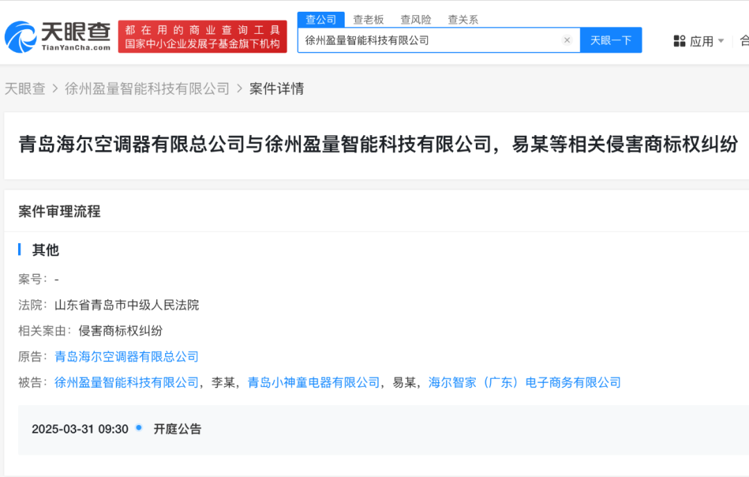 因为市场竞争问题,2月10日,青岛海尔空调器有限总公司以侵害商标权纠纷为由,将徐州盈量智能科技有限公司等3家公司,一并起诉至青岛中院,并将于3月底开庭审理。