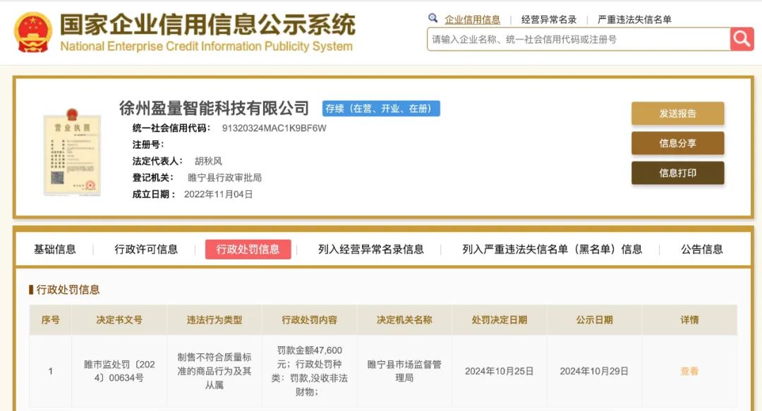值得注意的是,因为制售不符合质量标准的商品,2024年10月25日,睢宁县市场监督管理局对徐州盈量智能科技有限公司作出行政处罚,并罚款47600元。