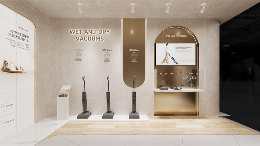 MOVA展区洗地机区域还设置了一个L型的瀑布屏,可以通过pad的操控来进行产品功能的演示,把技术创新更显性化的表现了出来,现场受到了许多观众的关注。同时MOVA还官宣了与时尚芭莎的合作,让洗地机化身为空间装置,与日常生活中的时尚配饰”组装“在一起,更有一种先锋者的姿态,探展过程中更像是跃入了一场生活的秀场。