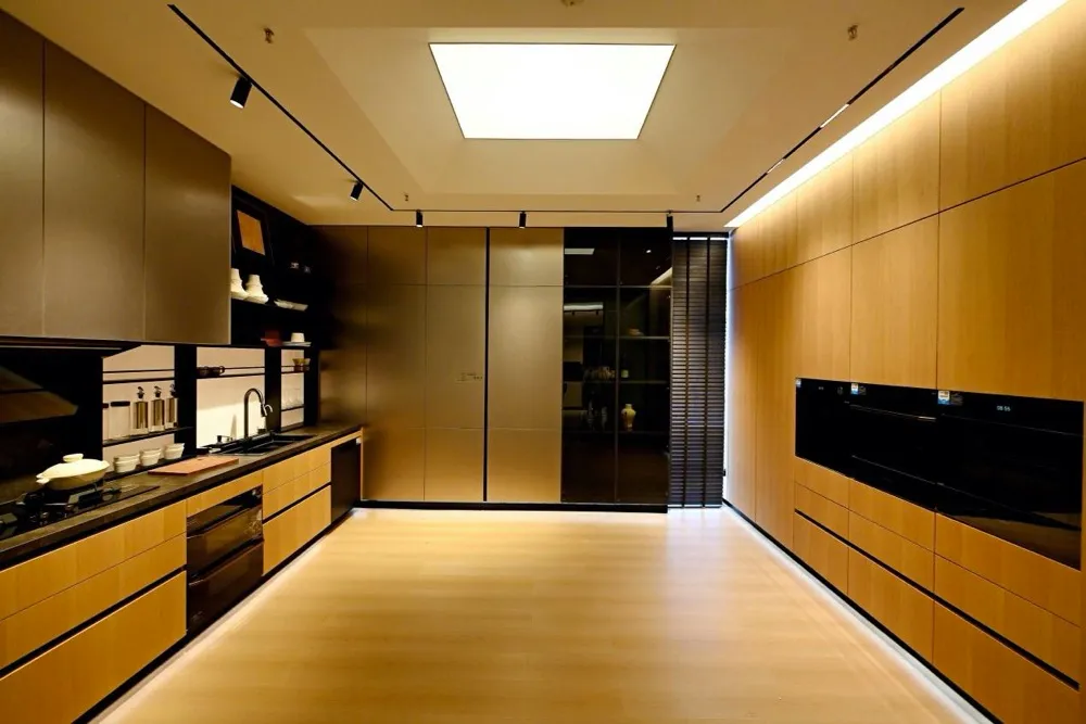 让我特别有感触的场景,智慧厨房算一个。厨房现在已经成为很多年轻人向往的家庭第二社交中心,大家不希望厨房是杂乱的,也不喜欢有很多油烟,以及需要繁琐打扫,而是希望其能轻松创造美食、享受美食。三翼鸟智慧厨房就做到了这些。在颜值上,冰箱与橱柜无缝贴合,连腰线、踢脚线都高度一致,面板材质也高度统一,烟机能全隐入橱柜,其他如蒸烤箱、洗碗机、垃圾处理器都全嵌入橱柜中。整个厨房高度简洁,但样样不缺。