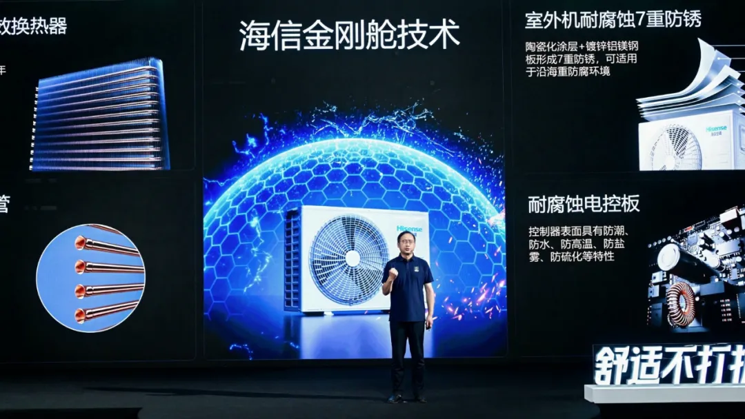 海信空调“金刚舱”技术推出,大大缓解了众多人的“焦虑症”。通过高耐腐长效换热器、无氧铜铜管、陶瓷化涂层+镀锌铝镁钢板形成7重防锈、耐腐蚀电控板等材质和工艺,让空调室外机做到10年“不泄漏”“不生锈”“耐盐雾”。破解了长期存在的空调室外机长期的日晒雨淋和风尘侵蚀,极易生锈和灰尘阻塞,引发的高空坠落和品质风险。