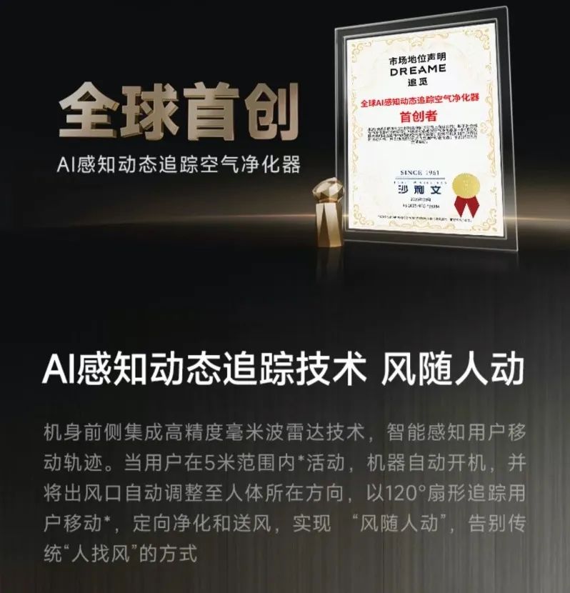 追觅原创的七维传感系统集成Multi-sense Tech技术,还能秒级监测室内甲醛、PM10、PM2.5、PM1、TVOC5类污染物,结合激光散射光谱技术还能精准捕捉1μm到10μm区间的颗粒物,实现从空气质量到温湿度环境的多维全域监控。同时,沙利文出具市场地位声明,追觅全球首创AI感知动态追踪空气净化器,首次实现“风随人动”,洁净空气主动找人,从“被动净化”迈向“主动服务”。