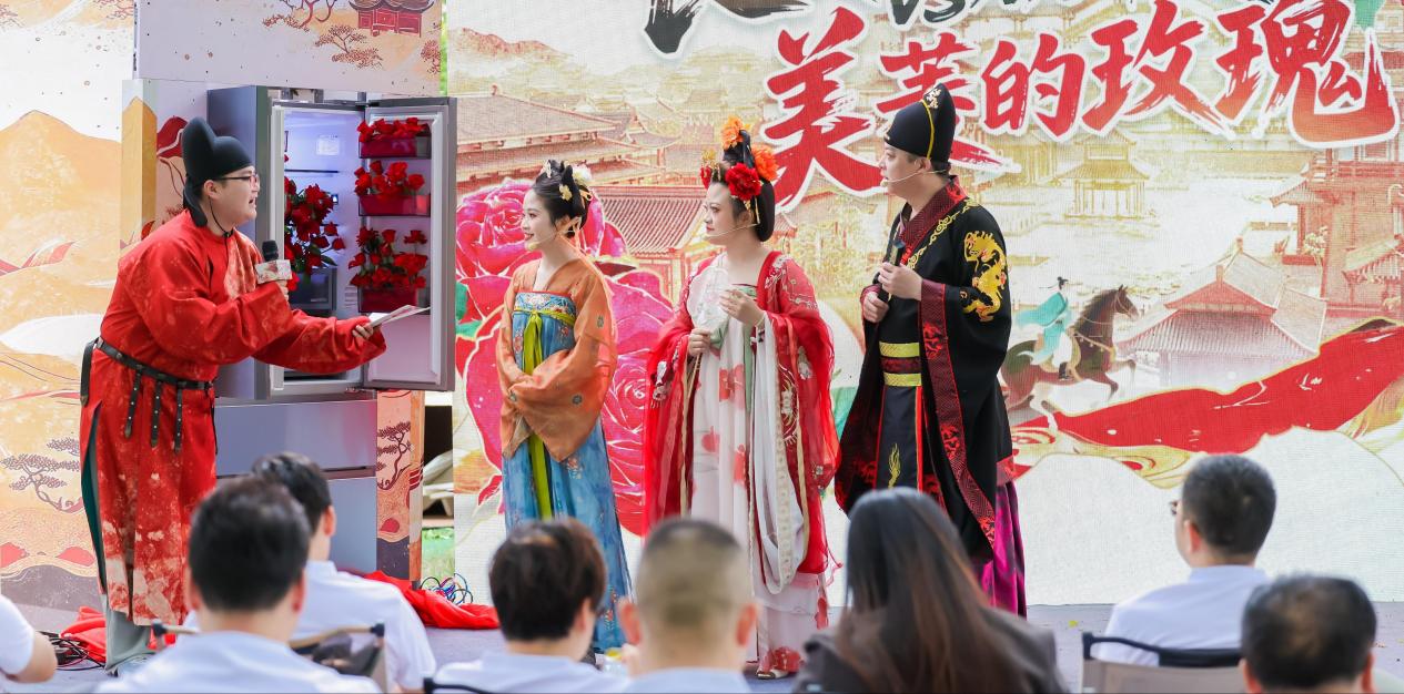 活动现场,情景剧以唐明皇为杨贵妃千里送荔枝的千古浪漫为引,揭示古人保鲜难题背后的爱情遗憾。美菱以“玫瑰保鲜33天”硬核技术,将现代科技与永恒情感联结——玫瑰不仅是爱情的象征,更是美菱长效保鲜技术的具象化体现。“荔枝”与“玫瑰”的跨时空对话,映射了从古至今人们对新鲜不变的追求。