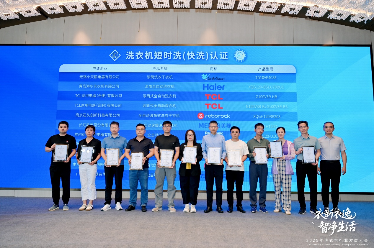 在快节奏生活场景下,“短时洗”成为消费者核心需求之一,其认证标准的建立对规范市场、保障体验至关重要。小天鹅滚筒洗衣干衣机TD10VE40SE、海尔滚筒全自动洗衣机XQG120-BSEU78BU1、TCL滚筒式全自动洗衣机G100V3R-HB、TCL 滚筒式全自动洗衣机G100V3R-B/G100V3R-BS、石头全自动滚筒式洗衣干衣机XQGH120RR203、美菱全自动滚筒洗干一体机RS21H120D、松下全自动洗衣机XQB120-U165、小吉全自动滚筒式洗衣干衣机V7-XMB Pro、惠而浦全自动滚筒洗干一体机WDD12W744SAOP、LG全自动滚筒洗衣机FC12DA2E、威力全自动洗衣机XQB80-2029C获得了中家院(北京)检测认证有限公司“洗衣机短时洗(快洗)认证”。