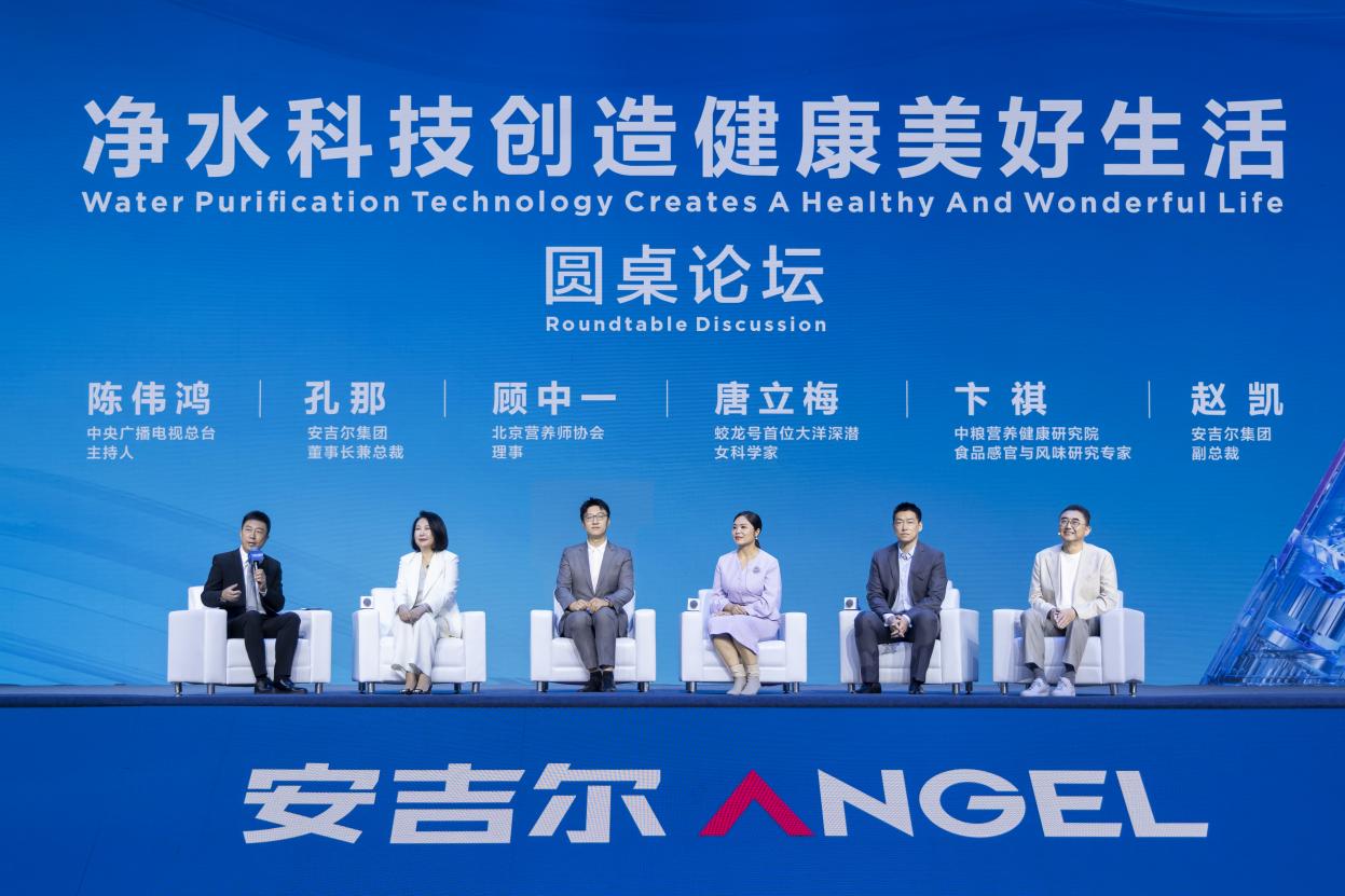 发布会上的圆桌论坛环节,安吉尔集团董事长兼总裁孔那、副总裁赵凯与营养师顾中一、科学家唐立梅、中粮食品感官与风味研究专家卞祺和主持人陈伟鸿围绕“净水科技创造健康美好生活”展开深度对谈。